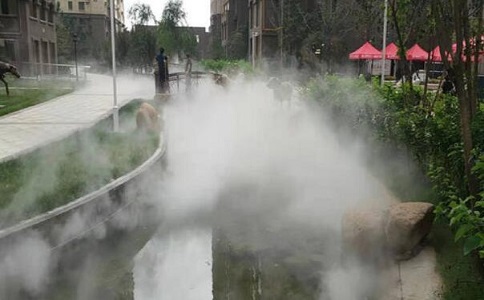 戶外空間環(huán)境降溫系統(tǒng),可以局部地控制大環(huán)境的溫度。人造霧降溫系統(tǒng)散發(fā)到空氣中的水微粒,在汽化的過(guò)程中要吸收大量周圍環(huán)境中的熱量,蒸發(fā)冷卻從而降低周圍環(huán)境溫度的原理